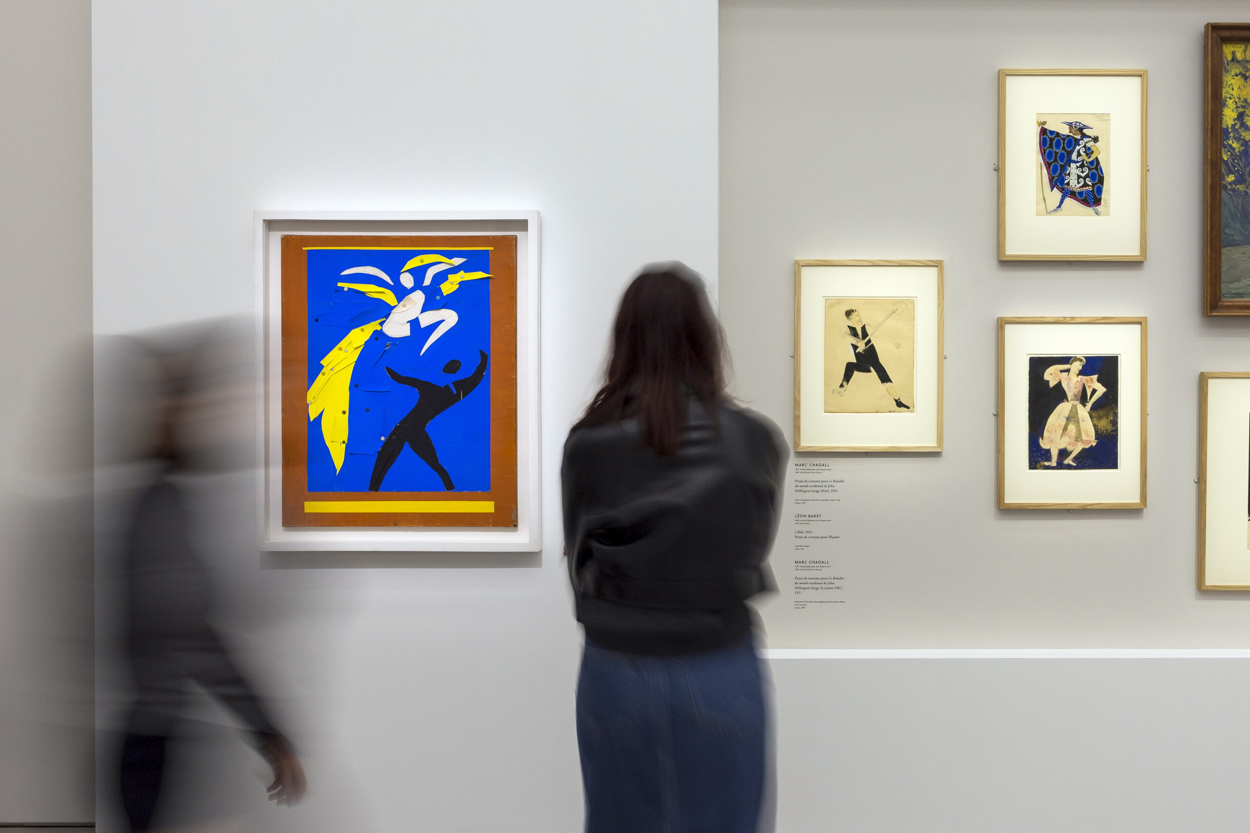Vue in situ. À gauche : Marc Chagall, projet de costume pour le Baladin occidental, 1921. Puis, de gauche à droite : Léon Bakst, L’Aède, projet de costume pour Phedre, 1923. Marc Chagall, deux projets de costume pour le Baladin occidental, 1921 © Centre Pompidou, MNAM-CCI / Dation Pierre Matisse, 1991 / Ph.: Luc Castel / Centre Pompidou